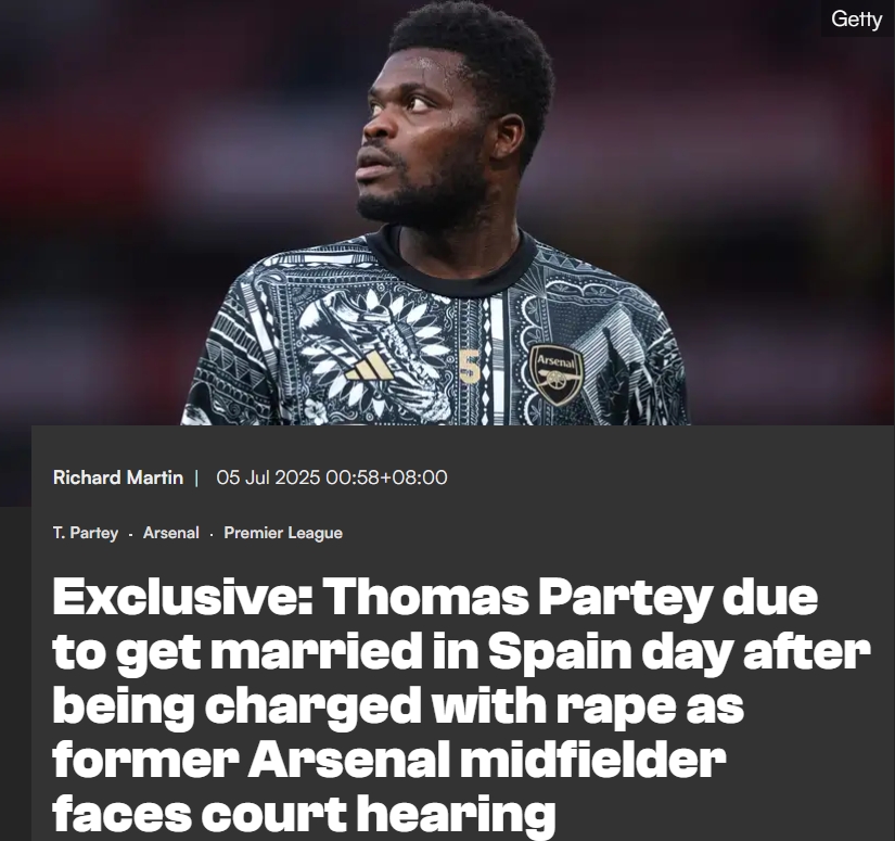 07月05日讯 前阿森纳中场托马斯-帕尔特伊昨日被英国警方正式指控涉嫌五项强奸罪和一项性侵罪。据进球网独家爆料,托马斯原本计划于当地时间本周六举行婚礼。