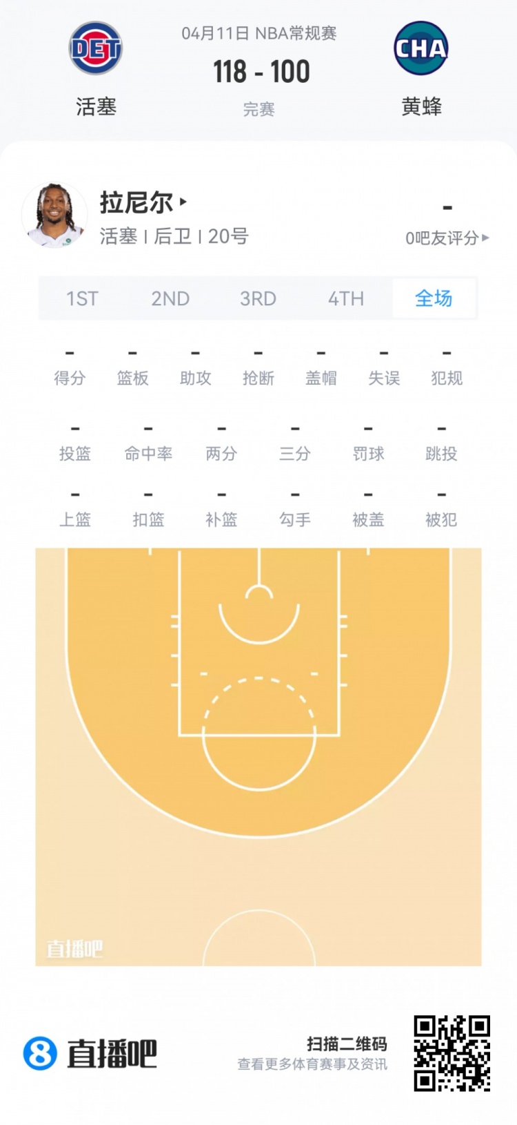 活塞次轮37号秀查兹·拉尼尔 登场1.8分钟